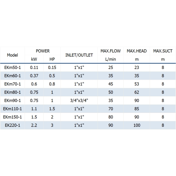 Suitable for use with clean water that does not contain abrasive particles and liquids that are not chemically aggressive towards the materials from which the pump is made.Thanks to their reliability, the fact that they are easy to use and are economical, they are ideal for domestic use and in particular for distributing water in combination with small pressure sets and for the irrigation of gardens and allotments.The pump should be installed in an enclosed environment, or at least sheltered from inclement weather.